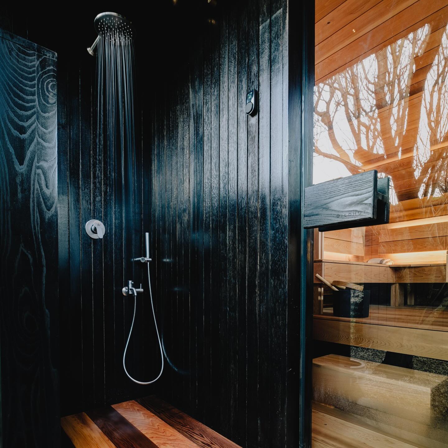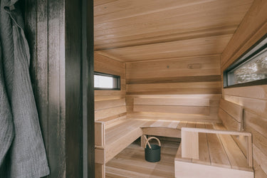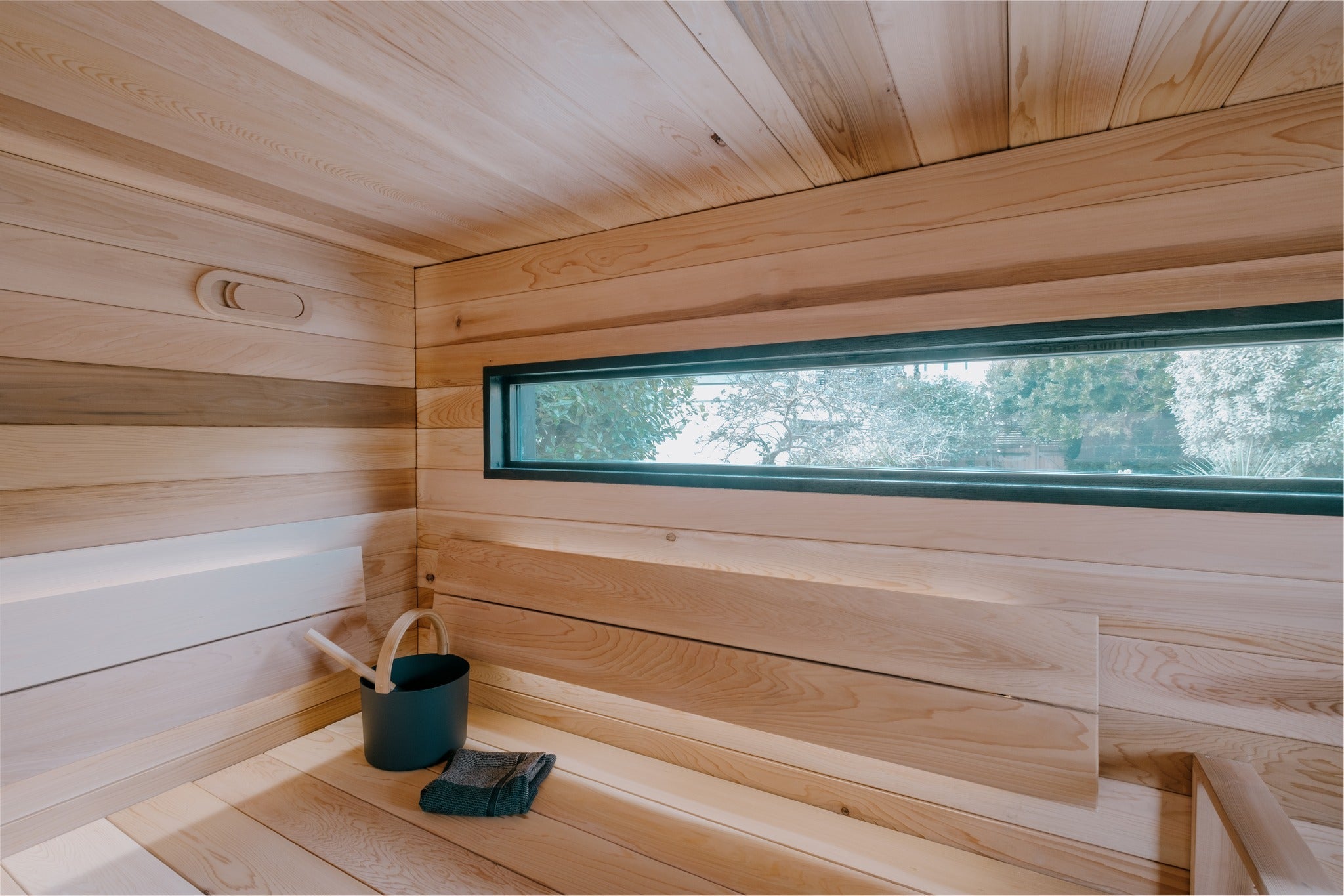 Crafted from Red Cedar, the sauna benches have a calm, consistent grain. Beneath them runs a dimmable light strip, offering a soft, soothing glow throughout the sauna. The exterior also features dimmable lighting, creating a warm, welcoming atmosphere from the outside. The sleek, minimalist design makes the Sanna Sauna the perfect choice for placing in a scenic spot you love.